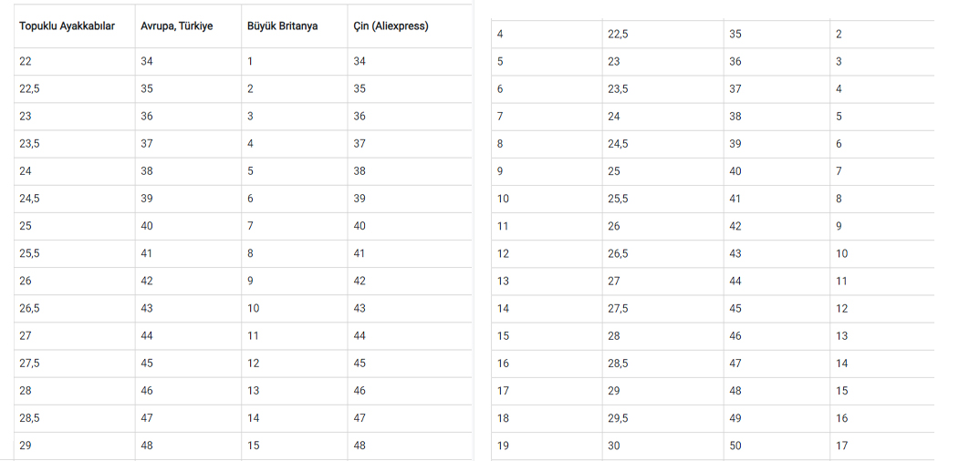 - EU ayakkabı numaraları ile ABD’deki (Amerika ayakkabı numarası) ölçü sistemleri farklıdır. Bu nedenle, ayakkabı numarası çevirme tablolarına dikkatlice göz atmak önemlidir.